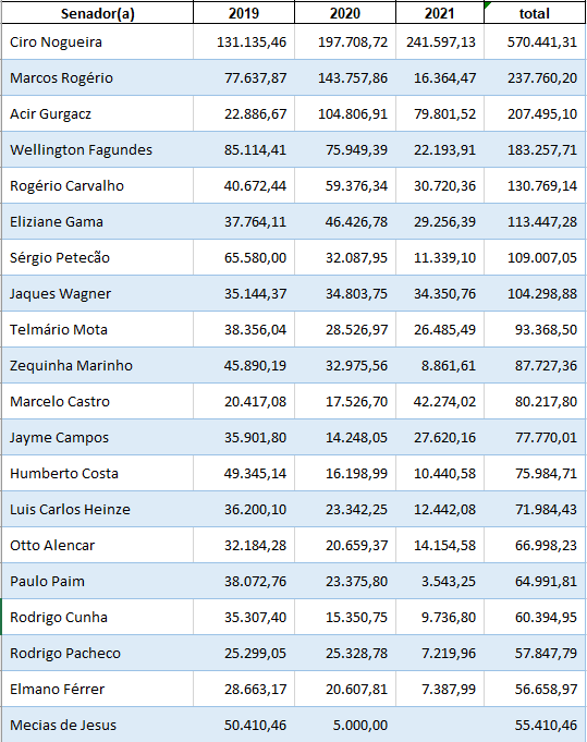 Mesmo tendo saído do Senado para assumir cargo no governo Bolsonaro, um dos caciques do centrão dificilmente deixará a liderança do ranking até o final de 2022. Isso porque os R$ 570 mil gastos até o momento representam mais que a soma do total dos gastos do 2º e 3º colocados.