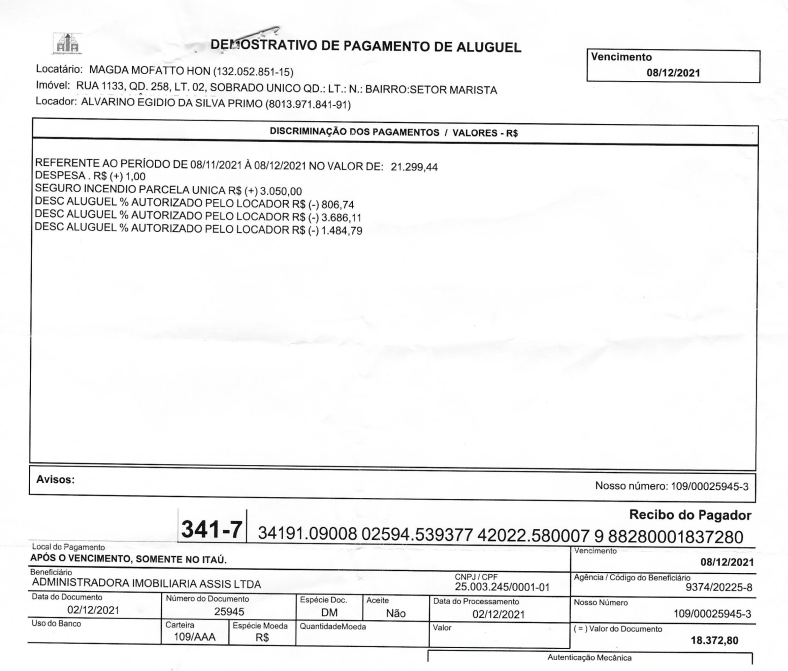 Aluguel do imóvel – R$ 15.321,80Novembro – R$ 18.371,80