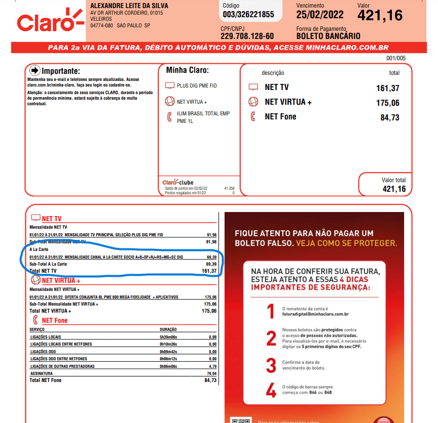 Os pagamentos para a empresa Claro vem acontecendo ao menos desde julho de 2019 e já somam mais de R$ 13 mil. Além dos canais exclusivos de futebol, as faturam mostram ainda que estão disponíveis internet de 600 mega, telefone fixo e TV a cabo.