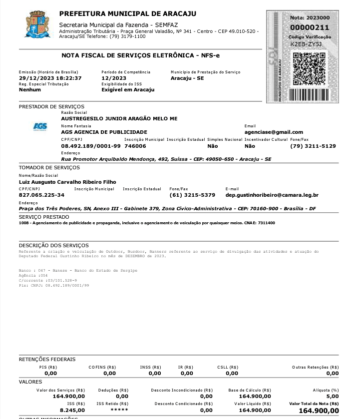 A maior nota fiscal reembolsada no período foi apresentada pelo deputado Gustinho Ribeiro (Republicanos-SE). Emitida em 29 de dezembro do ano passado, a nota Nº 00211 da empresa Austregesilo Junior Aragão Melo ME descreve a prestação de serviço de divulgação parlamentar, com a criação e veiculação de outdoors, busdoors e banners. O valor é de R$ 164,9 mil.