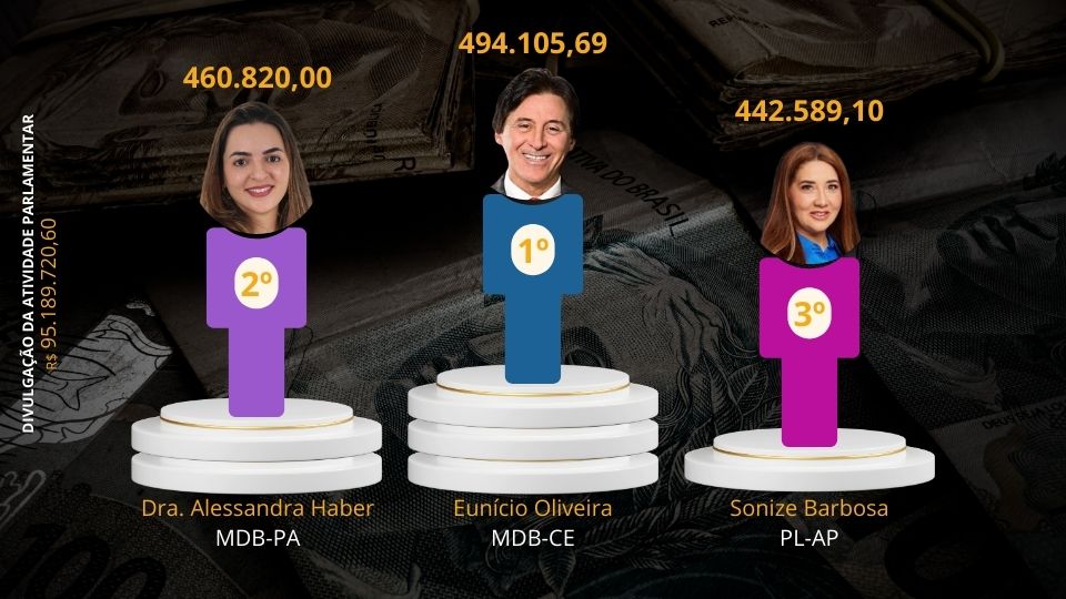 Os mais ávidos gastadores com a autopromoção são, em primeiro lugar, Eunício Oliveira (MDB-CE) com gastos de R$ 494.105,69; em segundo lugar a paraense Dra. Alessandra Haber (MDB-PA), com valor de R$ 460.820,00; e em terceiro lugar a deputada Sonize Barboza (PL-AP), que gastou R$ 442.589,10.