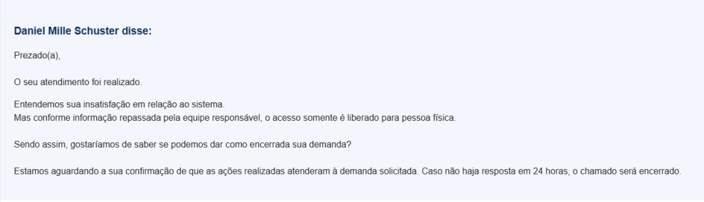 Foi somente após uma nova tentativa, por meio de contato telefônico, que um servidor do suporte informou – contrariando o aviso disponível no site – que o sistema não aceita demandas vindas de CNPJ. Mesmo utilizando o sistema Gov.Br, a restrição se manteve, evidenciando uma falha significativa na ferramenta digital do órgão responsável pela fiscalização do poder judiciário.