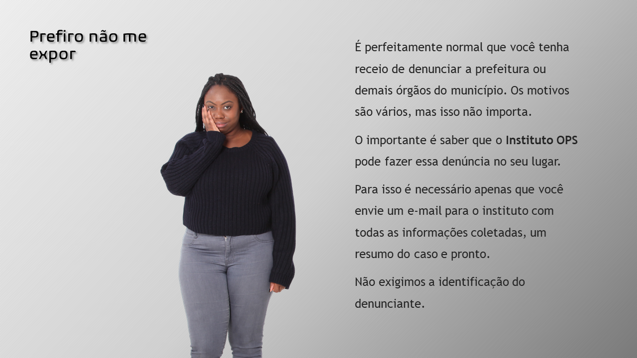 O Instituto OPS pretende mostrar que fazer parte do controle social é mais simples do que se imagina, colocando-se ainda à disposição da sociedade para denunciar as irregularidades encontradas no lugar dos cidadãos, preservando assim suas identidades.